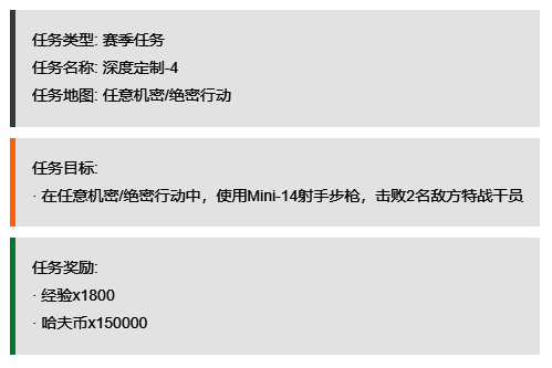 在任意机密/绝密行动中,使用Mini-14射手步枪,击败2名敌方特战干员。
