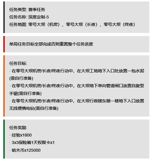 18、零号大坝完成保险柜任务+爆破铁门任务+消灭区域目标任务+任意高价值物品任务【可多局完成但中途失败任务重置【3-5局】