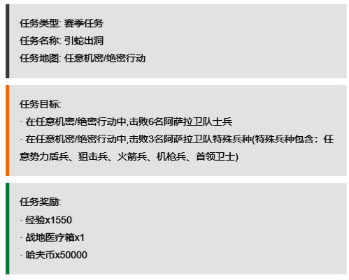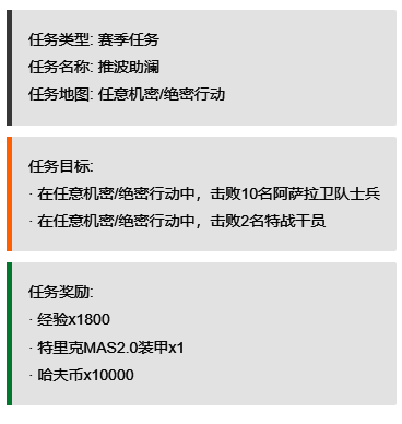 在任意机密/绝密行动中,击败3名阿萨拉卫队特殊兵种(特殊兵种包含:任意势力盾兵、狙击兵、火箭兵、机枪兵、首领卫士)