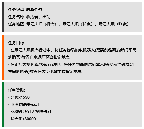 在零号大坝长夜/终夜行动中,将任务物品侦察机器人(需要前往研发部门军需处购买)放置在大变电站主楼指定地点。