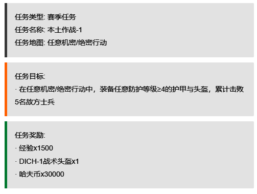 在任意机密/绝密行动中,装备任意防护等级≥4的护甲与头盔,累计击败5名故方士兵。