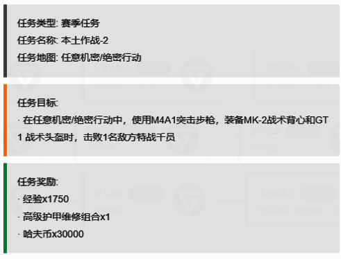 在任意机密/绝密行动中,使用M4A1突击步枪,装备MK-2战术背心和GT1 战术头盔时,击败1名敌方特战千员。