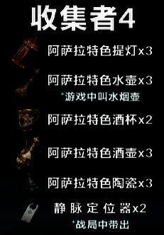 上交3个非绑定的阿萨拉特色提灯,3个非绑定的阿萨拉风情水壶(水烟壶),2个非绑定的阿萨拉特色酒杯,3个非绑定的阿萨拉特色酒壶,3个非绑定的阿萨拉特色陶瓷。