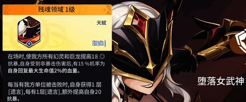 属性就不详细说了,这个品级的基本上也拉不开差距。重点是先看看女武神的天赋,在场可以提升己方所有幻灵和巨龙200的抗暴,自身在受到非暴击伤害的时候有几率回血。己方有单位被击败自身获得1层遗言,每层遗言加20抗暴。