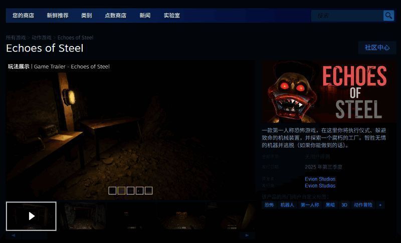 《Echoes of Steel》是一款由 Evion Studios 开发制作的第一人称恐怖游戏。而这款游戏的官网地址就是Steam平台的购买页面,进入到这个游戏的购买页面基本上就能知道所有这款游戏的信息。