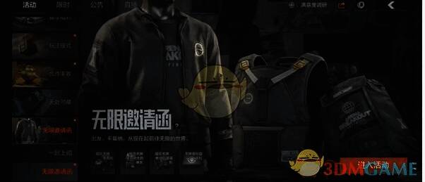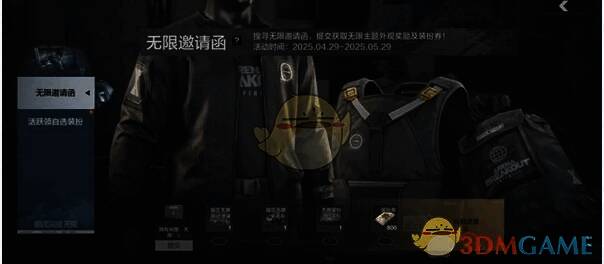 2、免费送联动外观:参与【无限邀请函】活动,可获得暗区无限联动主题夹克衫、KN突击防弹衣涂装、老旧口袋背包涂装。