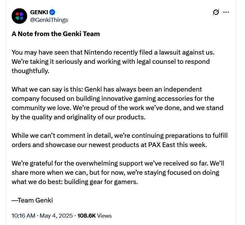 Genki在推特上声明称:"各位可能已经注意到任天堂最近对我们提起了诉讼。我们正在认真对待此事,并与法律顾问合作准备审慎的回应。我们能够说明的是:Genki始终是一家独立公司,专注于为我们热爱的游戏社群打造创新游戏外设。我们为已完成的工作感到自豪,并坚持产品的质量与原创性。"