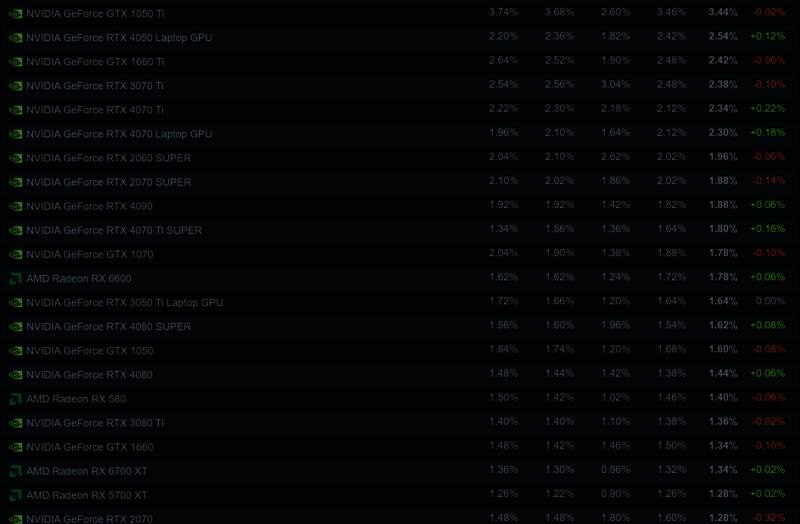 3月6日开售的AMD RX 9070,9070XT未能出现在Steam硬件调查榜中。反观英伟达方面,包揽了排行榜前12名,RTX 4060笔记本版依旧是最多的,占比9.6%,比3月还增长了0.96%。