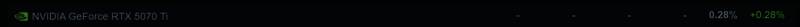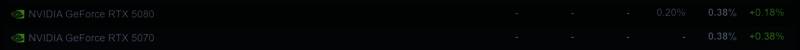 回到我们关注的RTX 50系上,目前排名最高的是RTX 5080,占比0.38%,其次是RTX 5070(0.38%)和RTX 5070Ti(0.28%)。