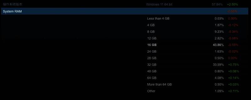 而在其他方面,Windows 11 64位依旧是最流行的操作系统,占比高达57.84%,大涨了2.5%,16GB系统内存最多,但比上个月下降了0.55%,32GB在崛起,比上个月增长了0.75%。
