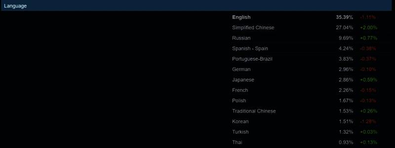 语言方面,英语目前位居首位(35.39%),但份额被其他语言稀释,中文占比27.04%,比上个月增长了2%,其次是俄语9.69%,增长了0.77,日语2.86%,增长了0.59%。