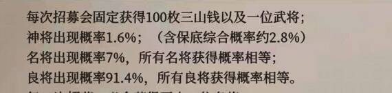 而且这个卡池还设有十分诱人的固定奖励机制,无论玩家每次抽取的结果如何,都能在每一次抽取中,获得100枚珍贵的三山钱,同时每次抽取还会必定获得一位武将,即使没有抽到高品质的神将或名将,也能积累不少可用的武将资源。