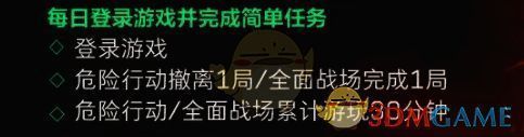 3、任务分别是“登录游戏”、“危险行动撤离1局/全面战场完成1局”和“危险行动/全面战场累计游玩30分钟”。