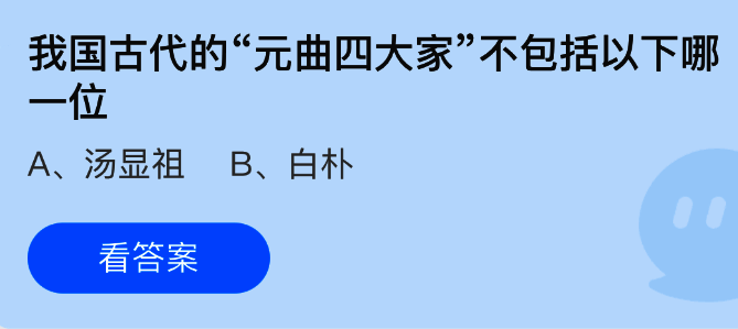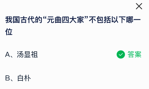 我国古代的“元曲四大家”不包括以下哪一位?这是支付宝蚂蚁庄园小鸡答题4月30日题目,支付宝小鸡答题是大家非常喜欢的活动,大家获取饲料就可以喂养小鸡领取更多的蛋去帮助更多的人了!今日正确答案是【汤显祖】,“元曲四大家”不包括汤显祖。元曲四大家通常指的是关汉卿、白朴、马致远和郑光祖,而汤显祖是明代戏曲家。