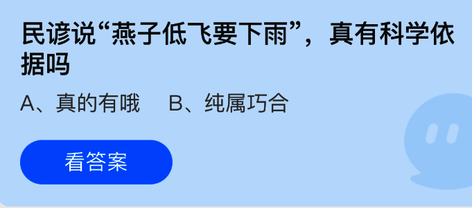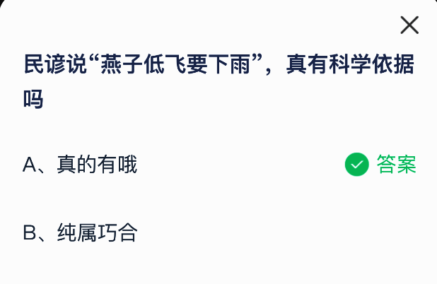 民谚说“燕子低飞要下雨”,真有科学依据吗?这是支付宝蚂蚁庄园小鸡答题4月30日题目,选择正确答案,答对可获得 180g 饲料,答错则获得 30g 饲料。为了保证正确率,本次给大家带来了今日正确答案:【真的有哦】。下雨前空气中的湿度较大,昆虫的翅膀较湿,飞行能力受到影响,只能在贴近地面附近飞行,这也使得燕子降低了飞行高度,以便更容易捕捉这些昆虫.