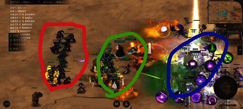 图中红色圈主要为巫师,绿色圈主要为治疗兵,蓝色圈为坦克兵及将领,巫师输出环境相当安逸。