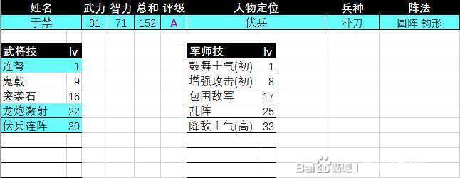 《三国群英传2》中有很多武将,于禁就是其中之一,然而很多玩家不清楚于禁的评级强度,首先,于禁是标准伏兵将,30级成型,连弩打将,龙激清兵,连阵造兵,比丁奉强,可惜的是武力不够高导致上限不足。