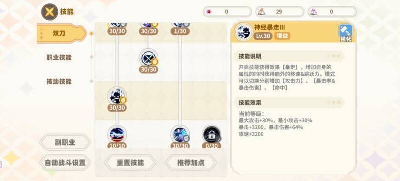 然后是双刀职业的加点,主动技能方面,十字技能可以选择不点,将技能点节省下来用于其他更重要的技能,咆哮技能只需点1级,其主要作用是用于开启狂风刺这个强力技能,除了这两个技能外,其余主动技能都应尽可能点满,强化技能的加点则取决于技能书的数量,当强化技能书较少时,推荐先点狂神觉醒和暴走,然后是凌波斩,最后再考虑大风车,因为技能书有限的情况下强点大风车和狂神觉醒不仅无法实现大风车的循环攻击效果,还会因为吃不到凌波斩远程剑气而导致整体输出效率降低。