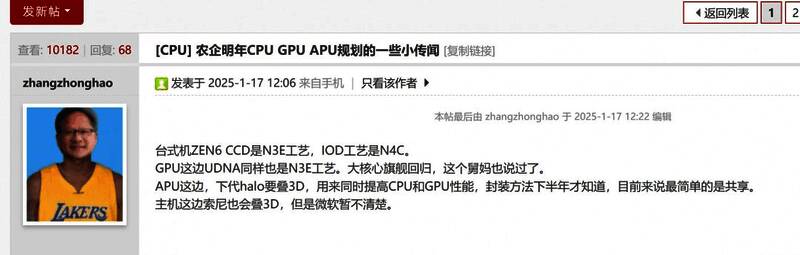 台式机ZEN6 CCD是N3E工艺,IOD工艺是N4C。