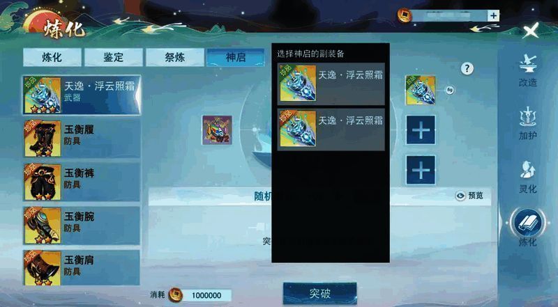 进行装备神启时,主副装备相同属性的条数越多,获得增强的几率就越大,因此推荐少侠优先选择与主装备拥有相同属性的装备进行突破。少侠每次突破前都可以通过预览功能,查看本次各条属性获得增强的几率。