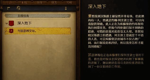 《天国:拯救2》中的深入地下任务是游戏里比较重要的一个任务,而想要做这个任务可以先和凯瑟琳进行对话,完成与凯瑟琳的对话后,你的目标是找到列支敦士登。你需要警告他注意安全,但你还有另一个目标,而找到他其实并不容易。
