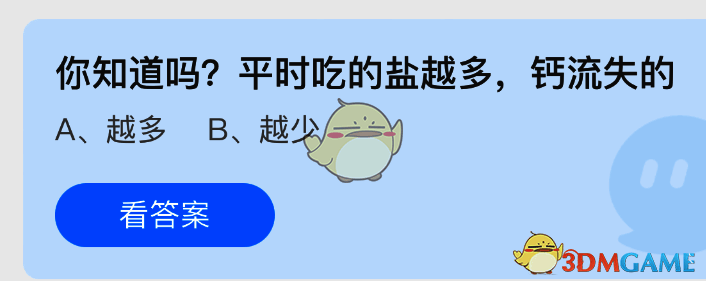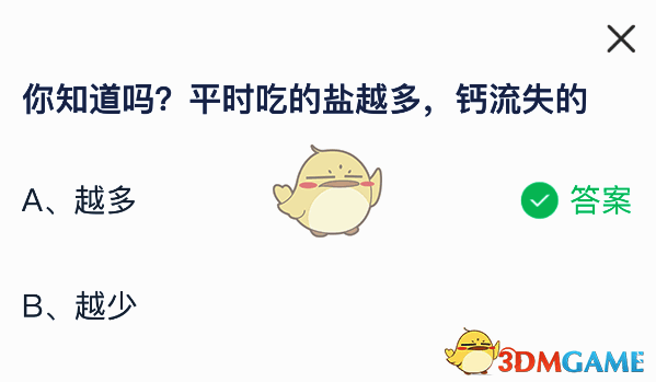 你知道吗?平时吃的盐越多,钙流失的?这是支付宝蚂蚁庄园每日题目,蚂蚁庄园完成每日最新的题目可以获得180g饲料。我们可以用饲料喂养小鸡。支付宝蚂蚁庄园2025年2月25日题目答案是【越多】。食用过多的盐可能导致体内钠和钙的平衡失调,从而增加了钙的排泄量,因此长期高盐饮食可能会导致钙流失。