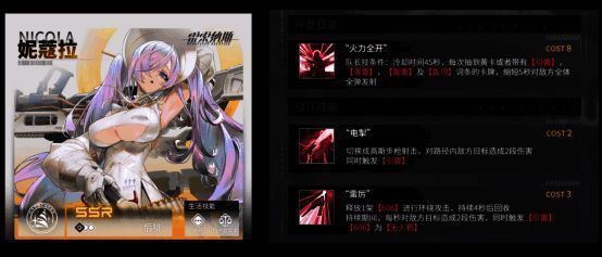 该技能高达8费,CD45秒。需要抽取黄卡和所有带有雷系词条的卡牌才能冷却CD,同时表明妮蔻拉在队伍中只能作为队长使用。