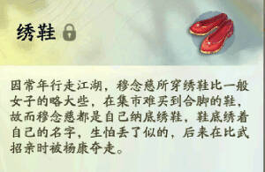 首先是穆念慈的红绣鞋,在原著的“比武招亲”中,杨康就夺走了穆念慈的红绣鞋,这也是两人情愫的开始,这也与其行走江湖的女侠人设有关。在《射雕》里穆念慈的角色界面中,就说明了穆念慈自学女红,自己纳底修鞋,方便江湖行走;