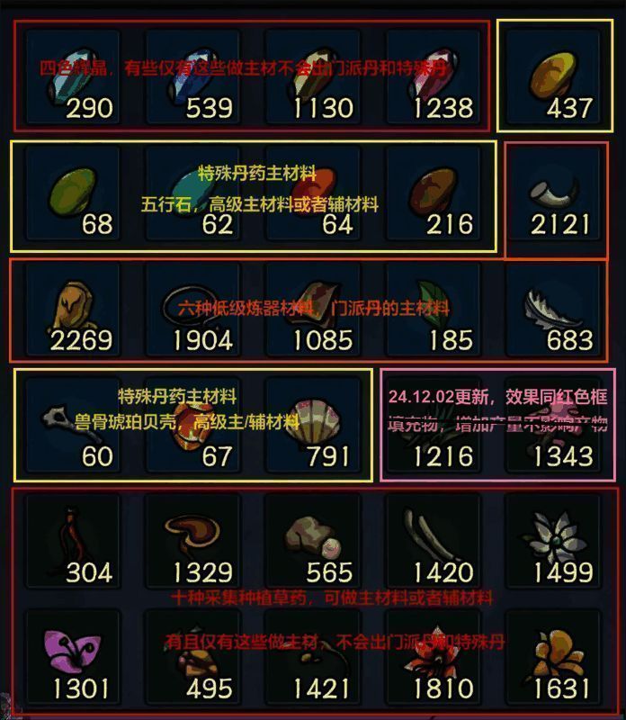 10.前期不建议使用羽毛,树叶,琥珀,兽骨,五行石(金石除外),四色辉晶进行炼丹,这些材料比较珍贵。