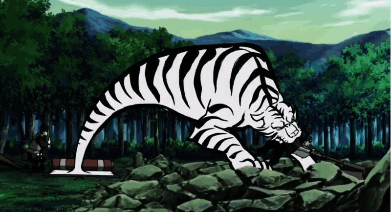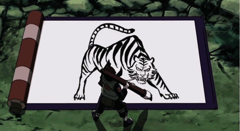 当佐井释放情感后,能以超兽伪画为基础,用巨大的毛笔在巨大的画卷上画出一只巨大的猛虎,然后双手结印,猛虎化作活物从画卷中冲出,咬住敌人,将其强行拖入画卷中并永久封印!