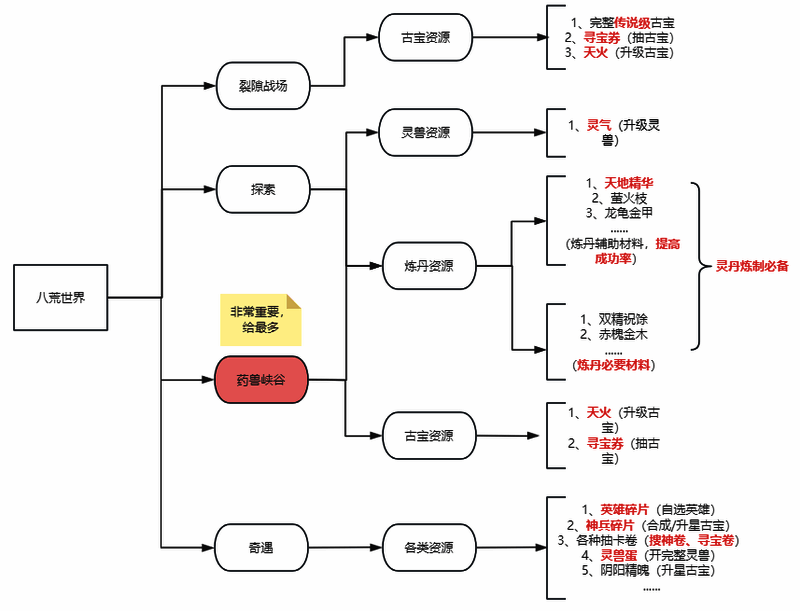 【八荒世界】串联了古宝、炼丹、灵兽这几个核心的养成系统,在这里能白嫖拿到不少有关这三个系统的养成资源,里边的内容是每日必做的玩法。【八荒世界】核心就是:探索、摸索。要玩的东西就这四个:裂隙战场、探索、药兽峡谷、奇遇。