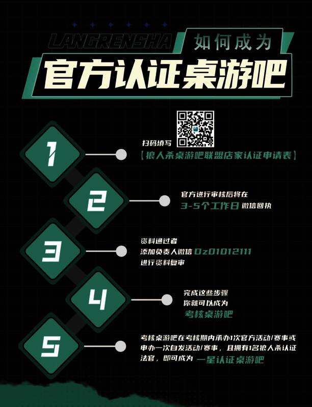 狼人杀桌游吧联盟持续招募中!如果你的桌游吧也想成为城市赛点,那就扫描下方二维码加入狼人杀官方桌游吧联盟,不仅有机会获得承办权,还能了解最新赛事活动承办方式。