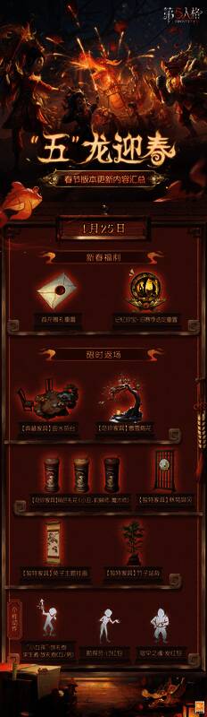 烧龙锣鼓响,心蓬厂;烧龙烟花起,人欢喜!网易首款1V4非对称竞技手游《第五人格》春节活动即将开启,惊喜时装、剧情活动将陆续上线,与各位访客们共迎阳木龙年,齐聚庄园追逐!