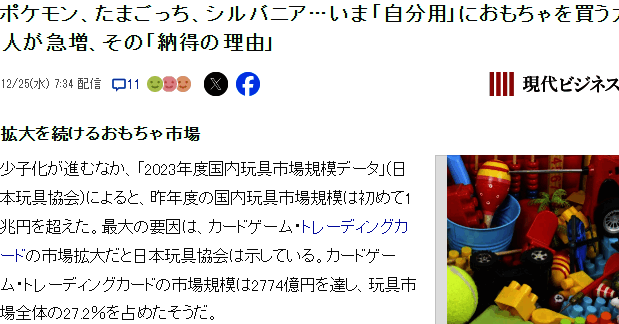 根据日本玩具协会的最新统计报告,显示日本的玩具市场规模正在不断急速扩大,2023年年度首次突破了1兆日元,包括宝可梦卡牌、电子宠物机等等,已经不在是以孩童为主体的市场了。