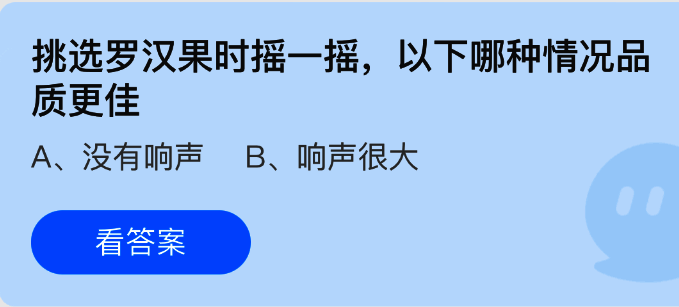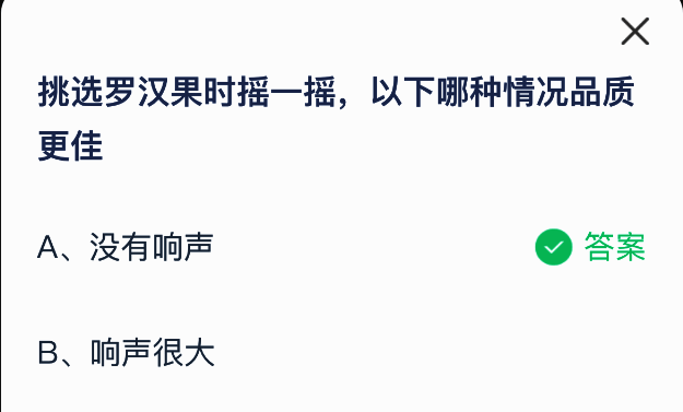 挑选罗汉果时摇一摇,以下哪种情况品质更佳?这是支付宝蚂蚁庄园小鸡答题3月26日题目,选择正确答案,答对可获得 180g 饲料,答错则获得 30g 饲料。为了保证正确率,本次给大家带来了今日正确答案:【没有响声】。当你轻轻摇晃罗汉果时,如果没有声音,说明果肉饱满、内部结构紧实,代表质量较好。