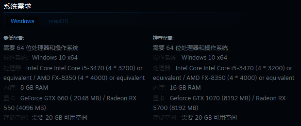 处理器: Intel Core Intel Core i5-3470 (4 * 3200) or equivalent / AMD FX-8350 (4 * 4000) or equivalent