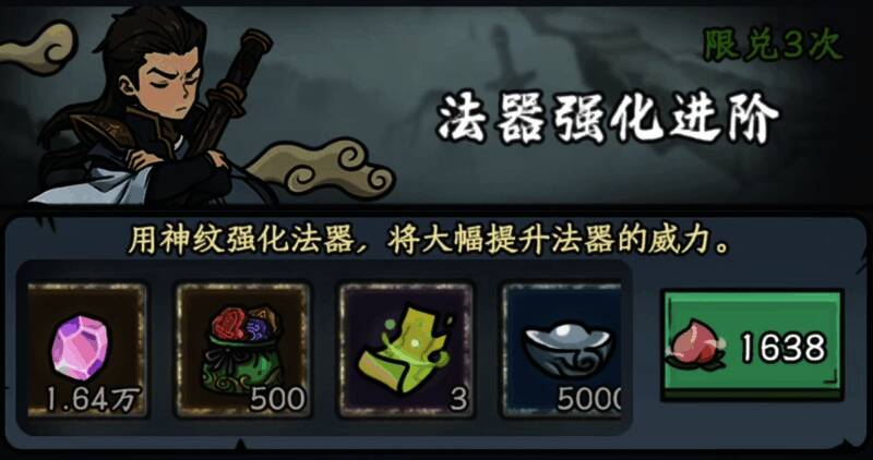 2、法器强化进阶礼包,就是500神纹的那个礼包,1638桃(有多余桃只换这个,每天三次,不一定要买满)