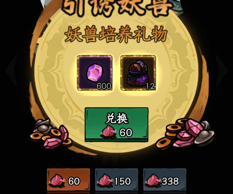 3、萌新第一只棉甲象没满阶之前,建议点击左上角仙师等级-仙缘礼物-引诱妖兽界面购买妖魄,差不多5桃左右一个。(注意不要和仙缘兑换里3238的妖魄搞混了 ,那个性价比极低)