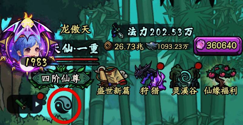 首先需要打过主线的秘道小沙弥,此时可以使用奇门遁甲,奇门遁甲可以点进右上角仙缘福利购买(28元720小时),也可以等法定节假日礼包白嫖,历练也有几率出,能实现自动挂机功能,购买后点击如下图红圈所示的小八卦开始自动打怪升级。