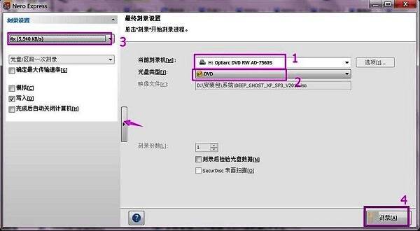 选择刻录机,光盘类型,刻录速度,然后点击“刻录”