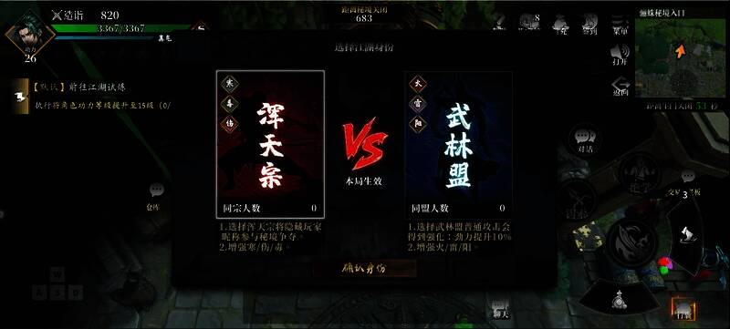 选择【浑天宗】进入秘境的玩家,在秘境中将会隐藏自己的昵称,其他玩家无法知道你是谁,浑天宗是各自为战无法组队,可以获得,寒,毒,伤的加成。
