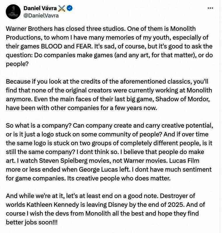 今天华纳宣布关闭包括《中土世界:魔多阴影》《极度恐慌》背后的开发商Monolith在内的三家工作室,消息公布后,很多业内人士表达了惋惜。不过《天国:拯救2》总监Daniel Vávra表达了一个非常新颖的观点:艺术(包括游戏、电影等)的创造力本质上来源于个体(即具体的创作者),而不是公司本身。他质疑通常人们对公司品牌的认知,他认为公司只是一个外在的标志,真正的创意和价值来自于背后的人。