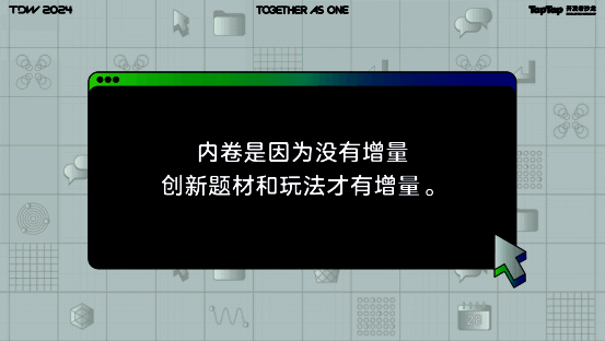 「去年,公司和行业都经历了低谷。我们坚持了下来,并在今年取得了一些成绩,希望把相关经验和教训,在 TDW 2024 与开发者进行坦诚的交流」,黄一孟表示,「我们将与开发者一起思考,如何把游戏做出题材和玩法的创新,减少内卷,带动行业做出增量价值。」