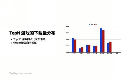 会前,我也拉了一下2023、2024年 TapTap 站内 TopN 游戏下载分布的数据。想回答大家一个问题,TapTap 对于游戏的分发,到底有没有更头部化?我们看到,在推荐算法的帮助下,TapTap 对于游戏分发的分布,其实更偏向于长尾一些。更置信地说,一定没有更头部化。