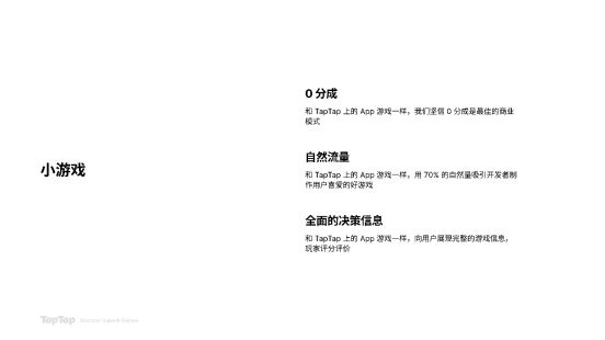 还想跟大家分享的是,我们尝试 TapTap 小游戏。我们把它当作一个技术能力,能给玩家更好的体验,就是用户不需要再把游戏下载到本地安装,特别是对于 TapTap 这样的第三方应用商店来说,是对用户体验有非常大帮助的一件事。我们虽然叫「小游戏」,但大型 3D 游戏也可以获得比较好的支持。小游戏也会坚持零分成,这是我们坚持的最佳商业模式。