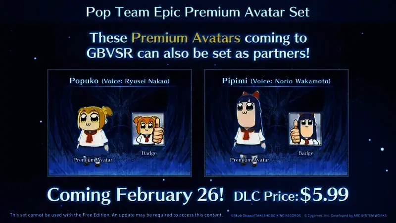 “PopTeam Epic”联动开始!动画和漫画作品《PopTeam Epic(pop子和pipi美的日常)》中的“pop子”和“pipi美”化身虚拟形象在《GBVSR》中登场。购买本商品不仅可获得大厅虚拟形象和用于个人资料的徽记,“pop子”和“pipi美”还会作为搭档为玩家加油助威。