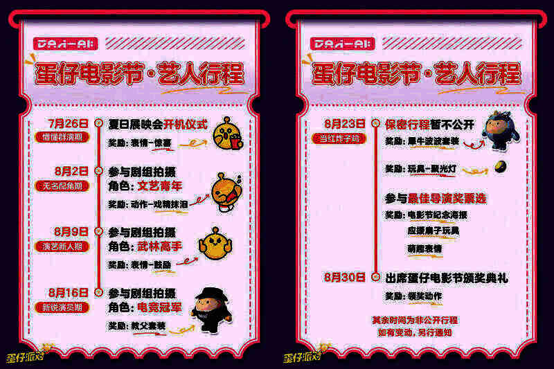 默默无名的蛋娱新秀能抵达怎样的高度,一切交由自己的努力来决定!7月26日至8月29日,完成【蛋娱圈升咖记】剧组任务,混迹各剧组感受沉浸式扮演,在完成拍摄任务中体验蛋生的另一面。若蛋仔们达到指定咖位,即可解锁特定的身份铭牌和艺人团队成员,还可将全新外观“教父套装”与“犀牛波波套装”、玩具“聚光灯”、动作“戏精抹泪”与“领奖”、表情“惊喜”与“鼓励”等奖励收入囊中!参与【最佳导演奖票选】,还可额外获得电影节纪念海报、应援扇子玩具和萌趣表情等众多奖励!