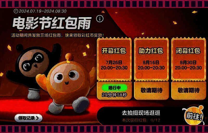 天降“大红大紫”,三场福利红包雨来袭!7月26日开机仪式、8月16日升咖成功、8月30日电影节落幕,这三天的20:00至20:30,都将发放电影节红包雨。前往拍摄现场即有机会获取红包,666枚彩虹币等丰厚奖励等你来领!