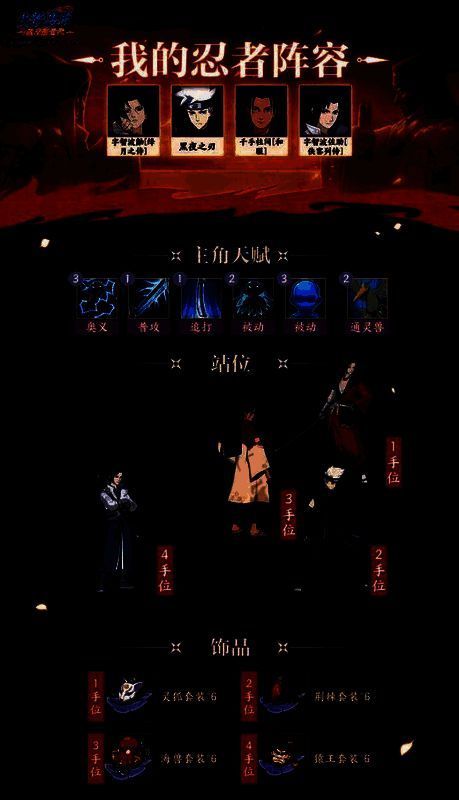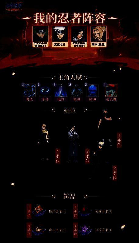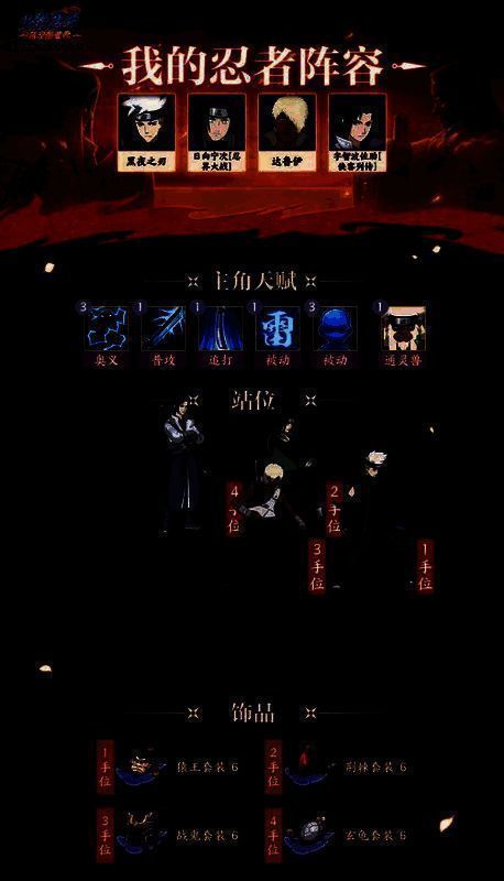 以上阵容推荐的天赋和站位,以及饰品搭配仅供参考,可根据自己的理解与实际情况进行调整。这次宇智波佐助[侠客列传]在游戏中展现了他攻守兼备的能力,自身拥有不俗的输出,还能为小队忍者提供辅助。这一世的他行侠仗义,除暴安良,无想之剑连斩,无双之剑守护。封尘绝念,驱风驭雷。可谓乱世出英杰,公子世无双!
