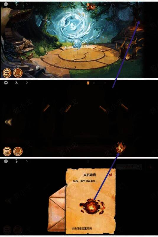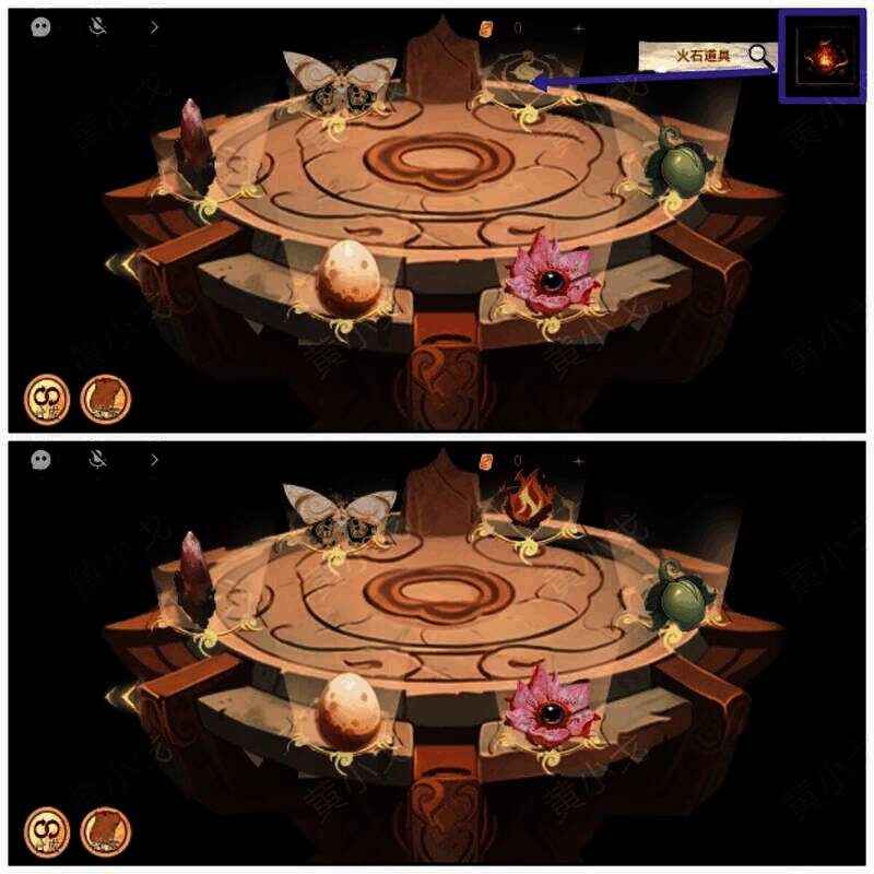 9.点击地上的罗盘,将罗盘调整到飞蛾、火石、种子、花➕火、蛋➕火后,点击中间的罗盘按钮后获得【火晶石】(根据需要收集的6种物品调整对应的图案)